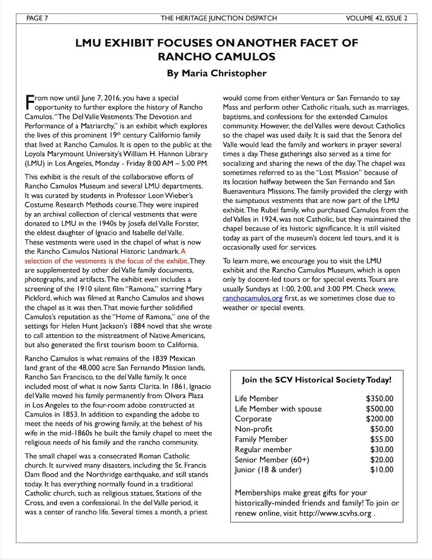 “The prominence and complexity of the del Valle family, nineteenth-century Californios owning a large land grant in Southern California, was made manifest through their family home, Rancho Camulos, now a national historic landmark. There the matriarch, Ysabel del Valle, and her eldest daughter, Josefa, played leading roles in the creation and maintenance of the family's image. Ysabel's deep devotion to the Catholic faith ensured that the rancho's small, family chapel became the site of religious services regularly performed by visiting priests. With her close connections to the clergy, Ysabel created a site in which objects of devotion, including the vestments now at LMU, were intertwined with the family's social standing.