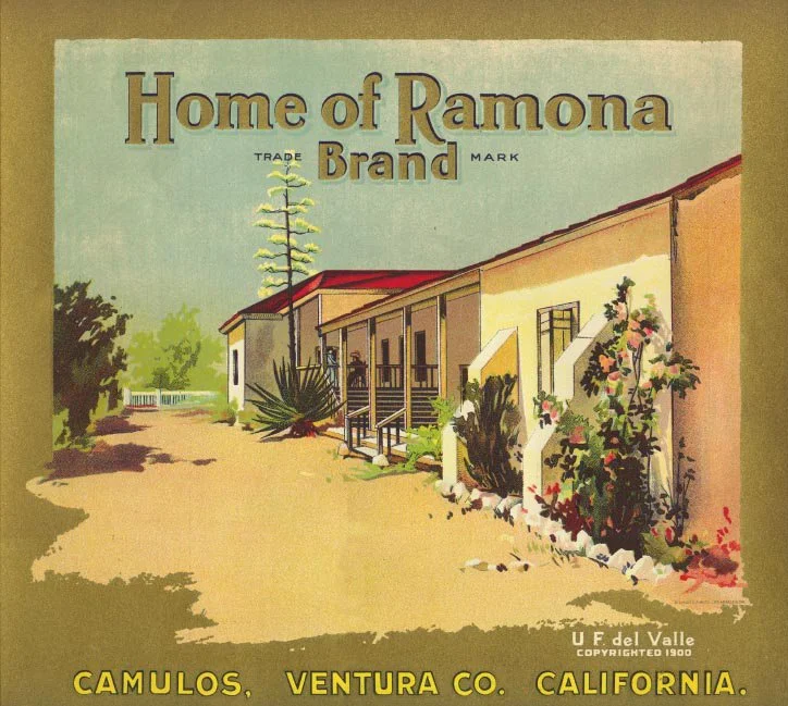In 1887 Ventura photographer John Calvin Brewster photographed Camulos, recreating scenes from Ramona which eventually were published in the San Francisco Chronicle. Del Valle family, members and friends posed for these scenes and others that depicted the romance between Alessandro and Ramona. Occasionally the family complained about the excursion trains that stopped at the ranch and the avalanche of tourists that descended upon the ranch demanding to see Ramona, and invading the orchards and house. Reginaldo del Valle even considered at one time building a hotel to accommodate tourists, when he thought his mother’s gracious hospitality was becoming a burden in her later years and the cost of accommodating so many guests was getting out of hand. The del Valle family eventually capitalized on the Ramona phenomenon by establishing the “Home of Ramona Brand” trademark for their oranges.