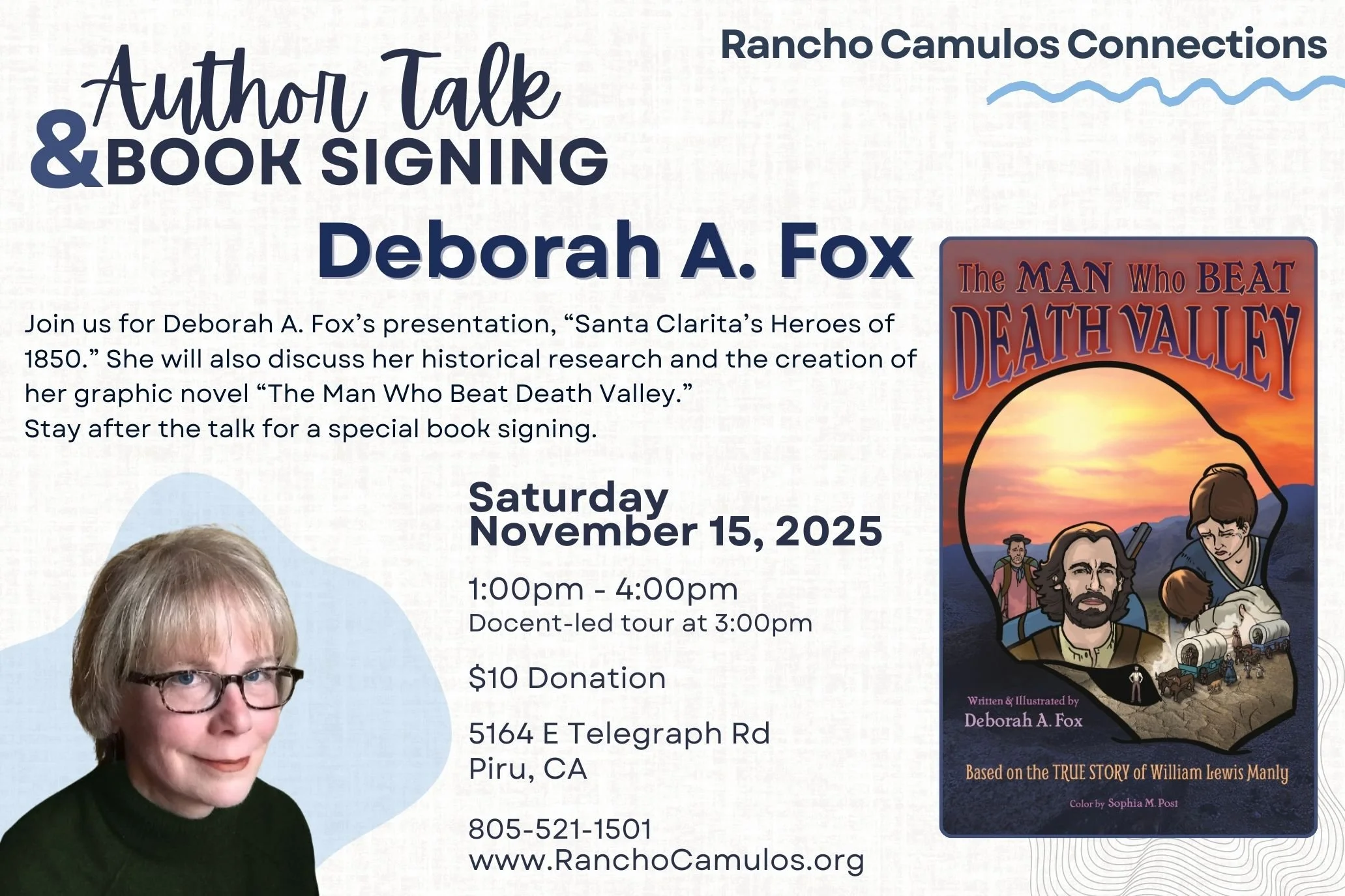 If you’re fascinated by California’s past, the Gold Rush, or the artistry behind historical storytelling, you won’t want to miss this event. Author and illustrator Deborah A. Fox will present her talk “Santa Clarita’s Heroes of 1850,” shining a light on the extraordinary people who shaped the region during one of the most dramatic eras in our history.