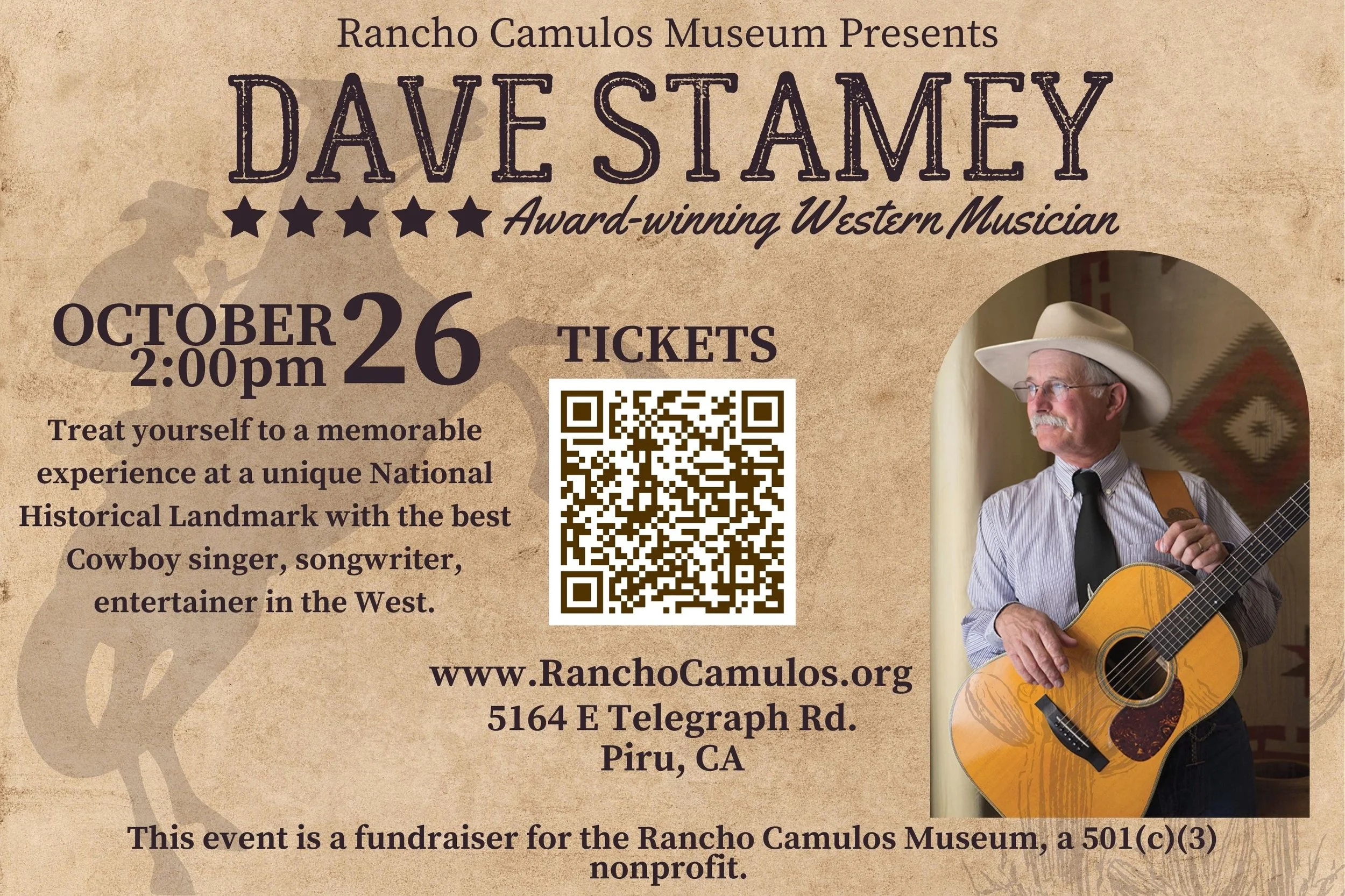 Join us on Sunday, October 26, at 2:00 PM for an unforgettable afternoon with award-winning western singer and songwriter Dave Stamey. Tickets are $30 and may be purchased at the door or online at RanchoCamulos.org.